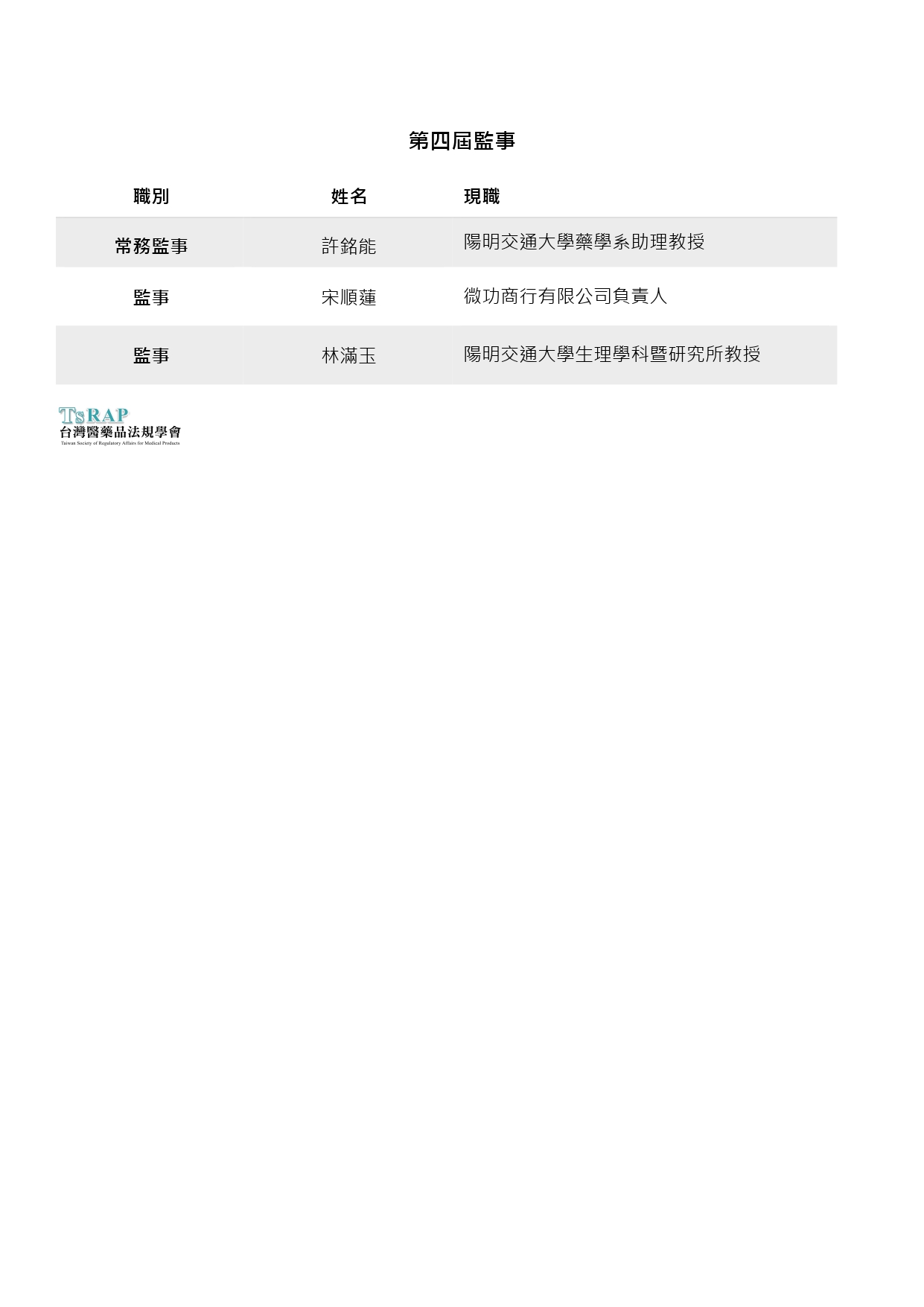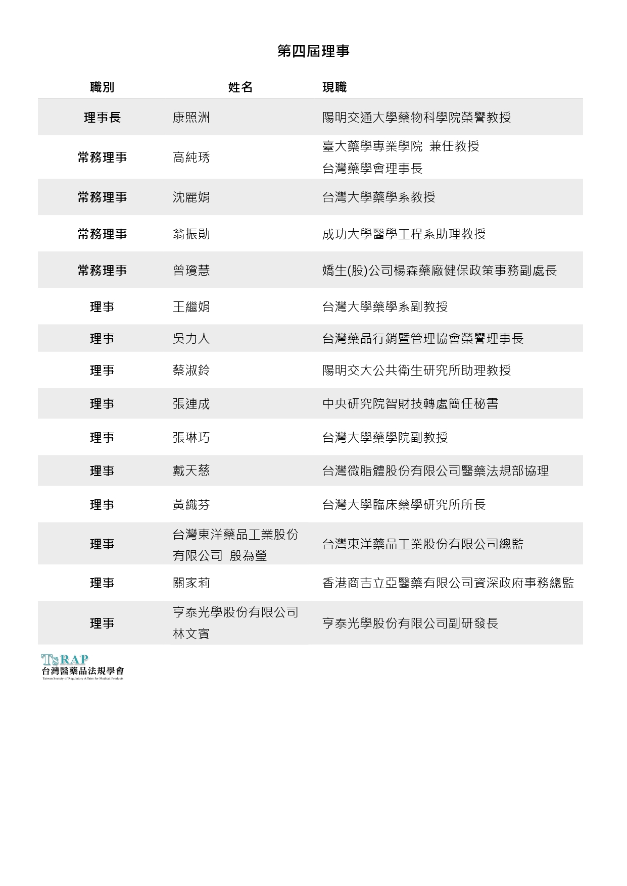 台灣醫藥品法規學會第四屆理監事名單