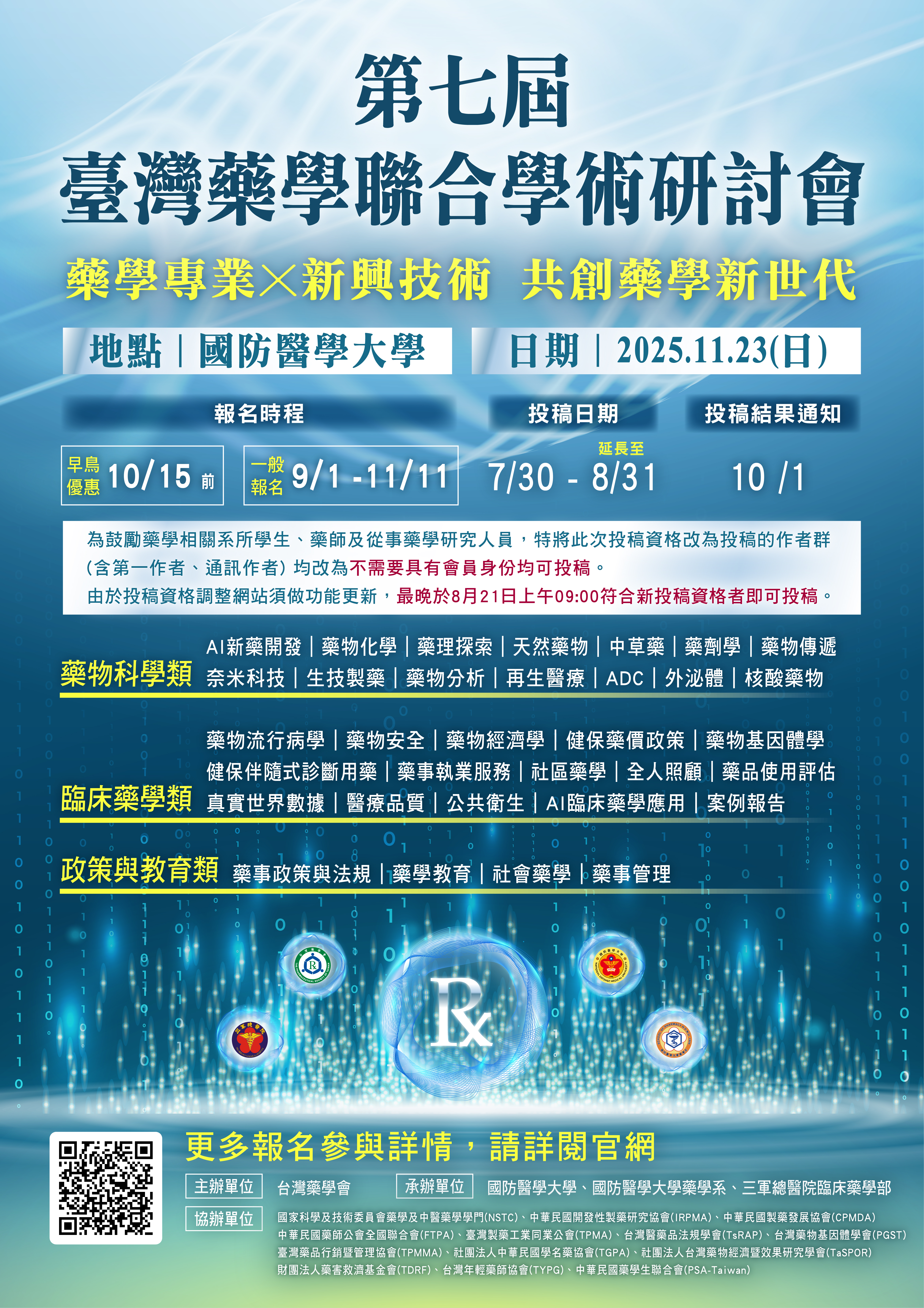 第七屆臺灣藥學聯合學術研討會」將於 2025年11月23日(日)假國防醫學大學 舉行,