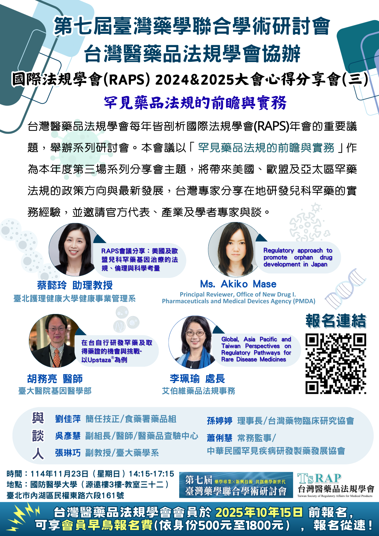 ※學會於下午有國際法規學會(RAPS)2024&2025大心得分享會(三)『罕見藥品法規的前瞻與實務』專場,敬邀共襄盛舉