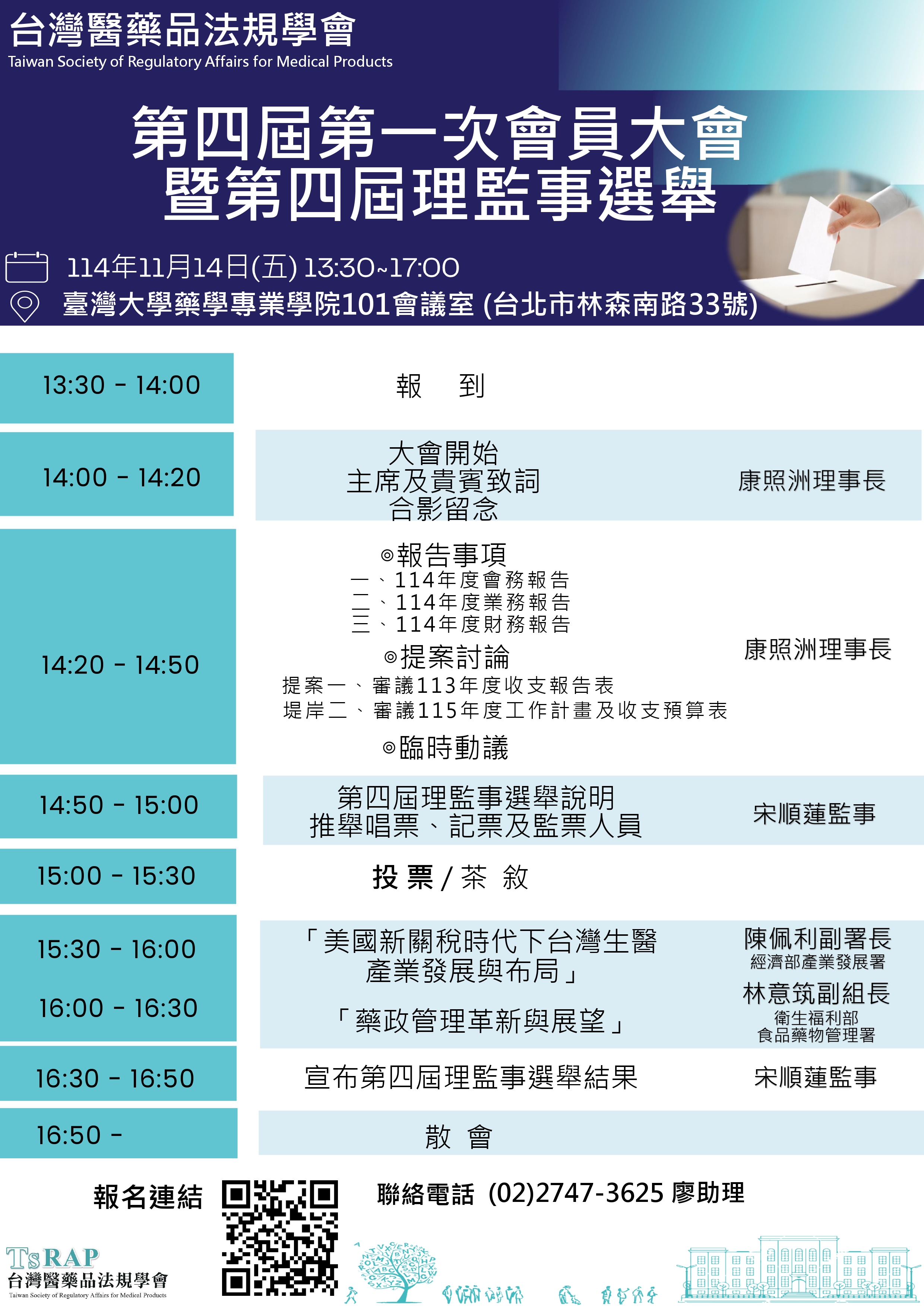 本會訂2025年11月14日(五)下午13:30-17:00,假台灣大學藥學專業學院 101會議室,舉辦第四屆第一次會員大會暨第四次理、監事選舉,特邀經濟部產業發產署陳佩利副署長及食品藥物管理署林意筑副組長於會中演講,敬邀所有會員撥冗參加。