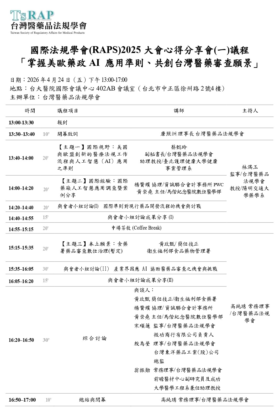 本分享會將帶領您深入剖析美國 FDA 與歐盟 EMA 的整合人工智慧之工作流程、國際藥廠目前應用 AI 的現況,並討論我國食藥署應用 AI 協助醫藥品審查的願景。這不只是一場單向的演講,更是一次產業界的深度協作,透過小組研討與成果分享,您將能與同業共同探討實務上的機會與挑戰,擬定最佳因應策略。誠摯邀請您參與這場跨領域的對話,共同描繪台灣智慧醫療法規的藍圖。
