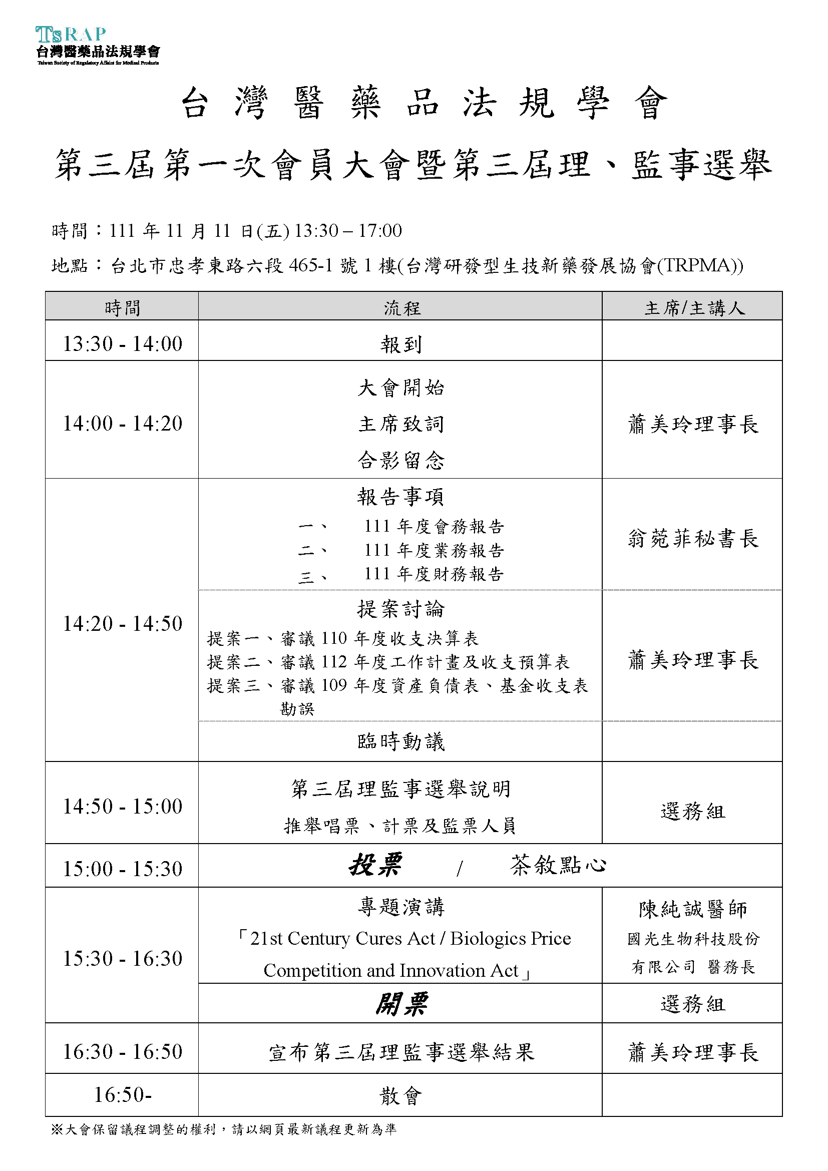 本會預計於2022年11月11日(五)下午13:30-17:00,假 台灣研發型生技新藥發展協會(TRPMA)會議廳,舉辦第三屆第一次會員大會暨第三次理監事選舉,特邀陳純誠醫師