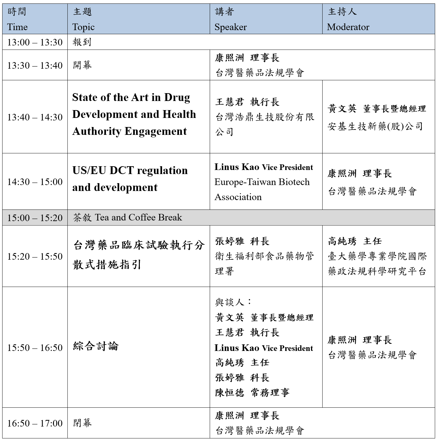 台灣醫藥品法規學會非常榮幸邀請到長期深耘國際醫藥產業的王慧君執行長、Linus Kao副會長,以及食品藥物管理署張婷雅科長,分享對醫藥品監管法規趨勢的見解,及美、歐、台灣監管機構對DCT的政策措施等。竭誠歡迎對醫藥品法規及臨床試驗議題關切之會員及各界先進踴躍報名參加!