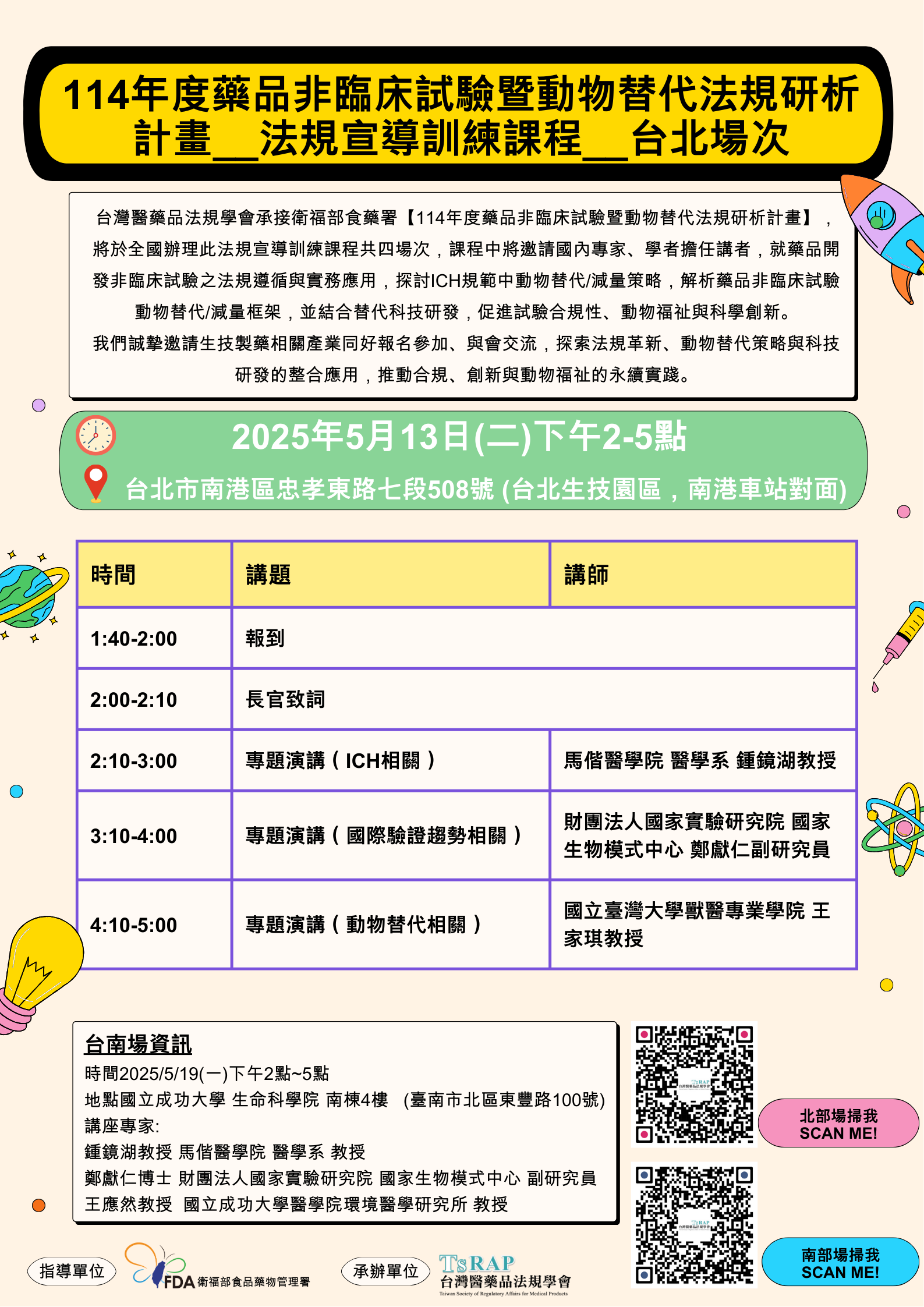 台灣醫藥品法規學會承接衛福部食藥署【114年度藥品非臨床試驗暨動物替代法規研析計畫】,將於全國辦理此法規宣導訓練課程共四場次,課程中將邀請國內專家、學者擔任講者,就藥品開發非臨床試驗之法規遵循與實務應用,探討ICH規範中動物替代/減量,解析藥品非臨床試驗動物替代/減量方法之驗證體系,並結合替代方法科技研發,促進試驗合規性、動物福祉與科學創新。